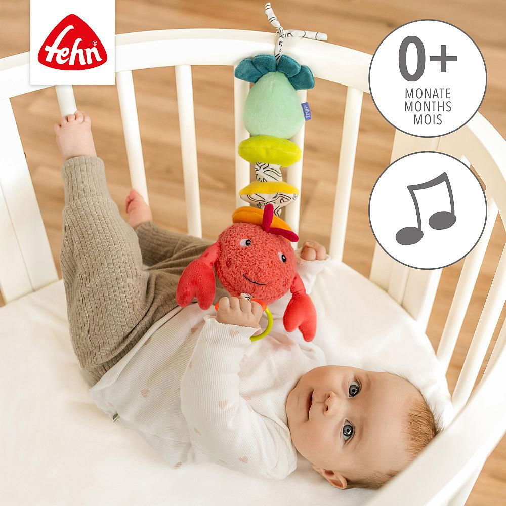 Usor de atasat la patut sau carucior: Doua panglici de prindere permit atasarea usoara la patut, carucior sau scaunul auto pentru bebelus. Clestii textili si inele moi ce incurajeaza apucarea, stimuland motricitatea fina