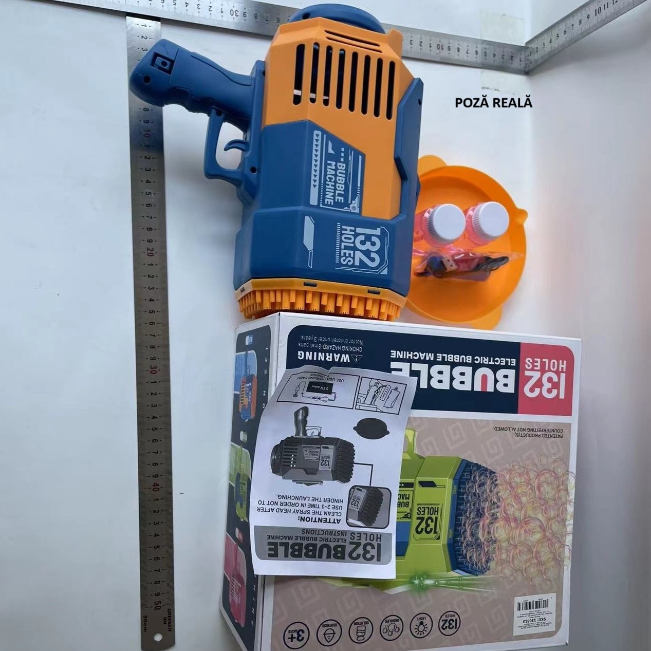 O mulțime de baloane de săpun Pistolul pentru baloane de săpun poate pulveriza peste 7000 de baloane colorate care zboară către cer în fiecare minut. Când apăsați pe trăgaci, vor fi lansate baloane, iar țeava se aprinde.