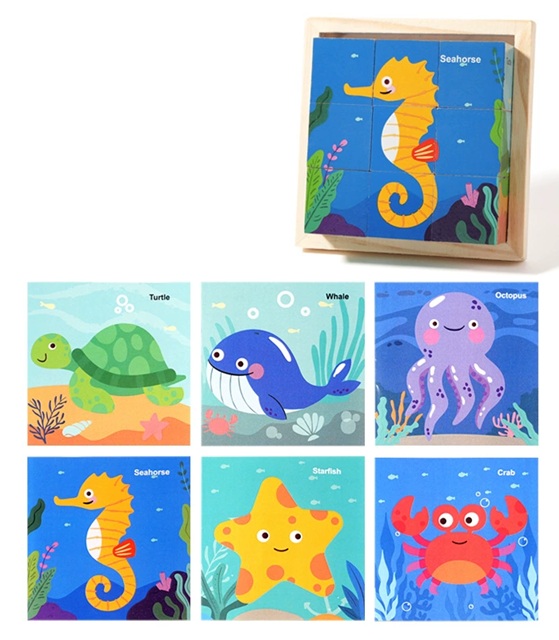 Puzzle din Lemn, Flippy, 9 Cuburi, 6 Fețe, 4–6 Ani, 11 x 11 x 3.2 cm, Model Animale Marine, Multicolor