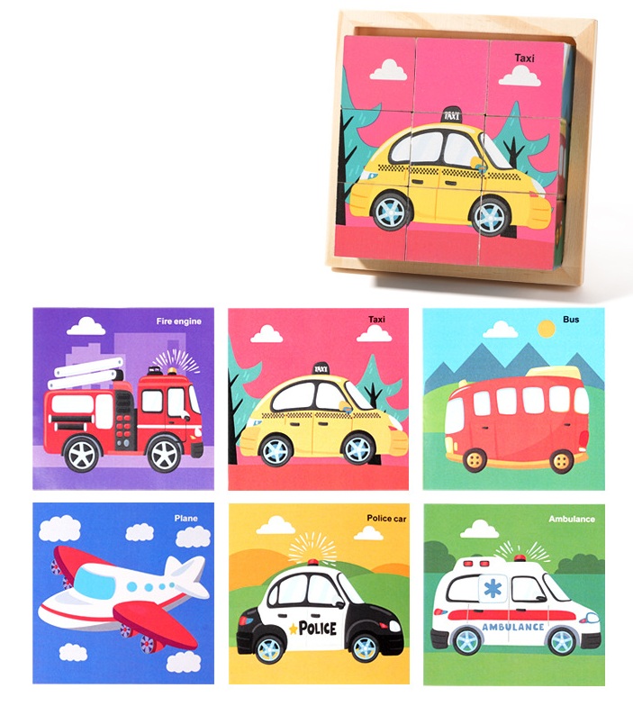 Puzzle din Lemn, Flippy, 9 Cuburi, 6 Fețe, 4–6 Ani, 11 x 11 x 3.2 cm, Model Masini, Multicolor
