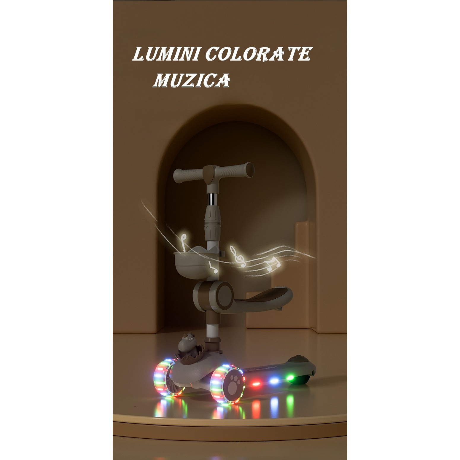 Trotineta Multifunctionala 3 in 1, Flippy, pentru Copii, 1-7 Ani, cu Lumini si Muzica, Reglabil 360, Pliere Usoara, Reglarea Inaltimii, Model Dinozaur, Alb/Bej