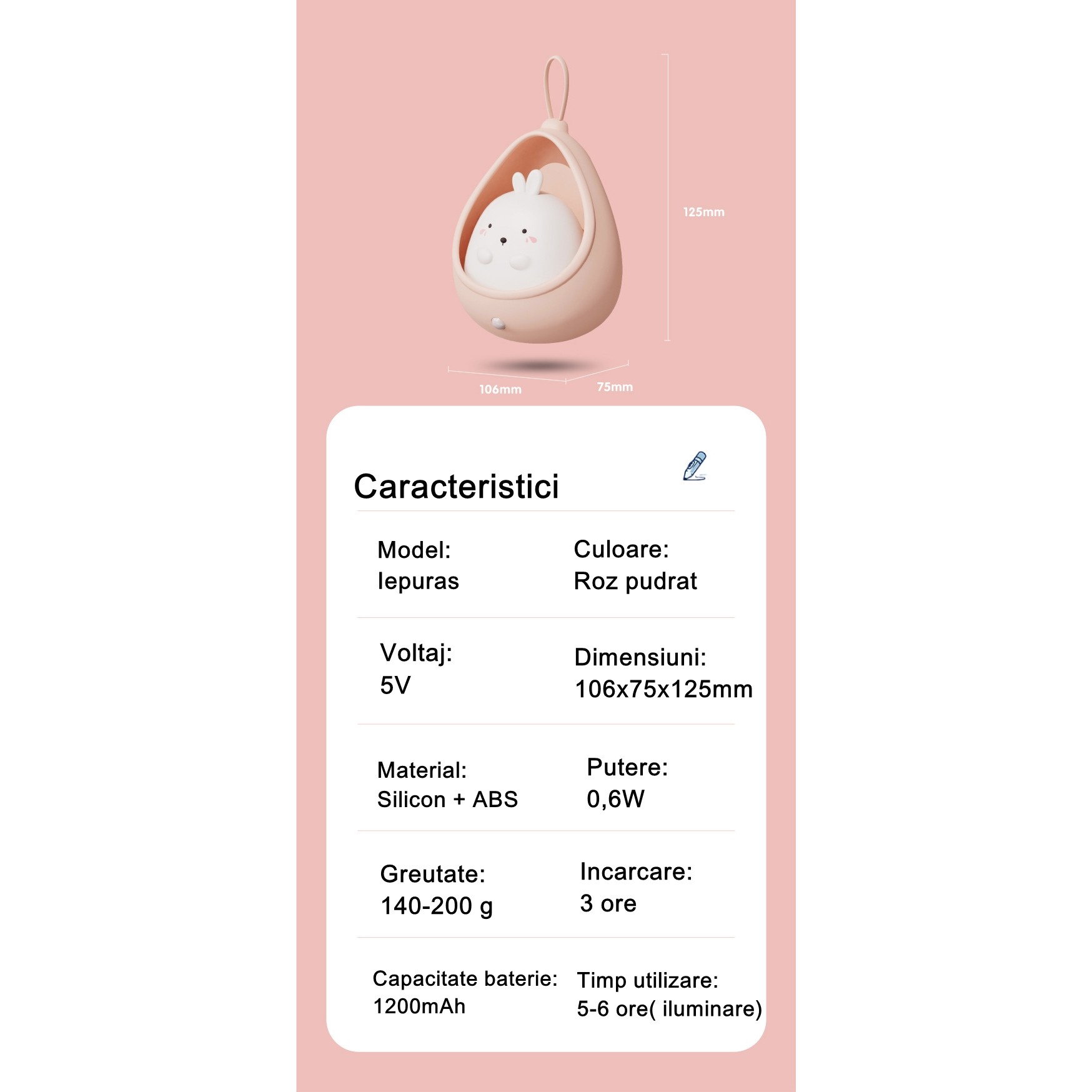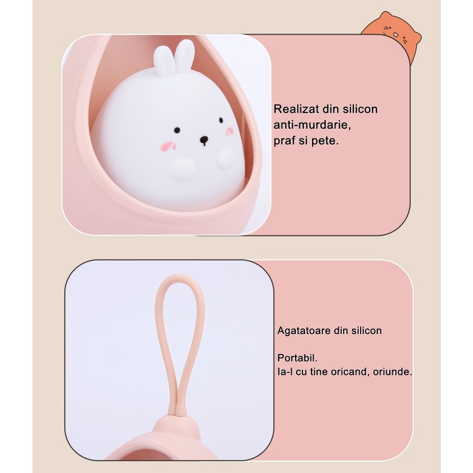 Continut cutie: lampa de veghe Iepuras, cablu USB, manual de utliziare. Adaptorul 5V (stecherul pentru priza) NU este inclus in pachet. Puteti folosi orice adaptor de smartphone.