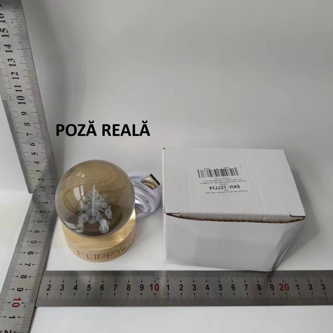 Lampa LED Decorativa, Flippy, cu Bila de Cristal cu Diametru 6cm, Model Brad de Craciun 3D, Alimentare USB, Suport din Lemn, Lumina Alb Cald