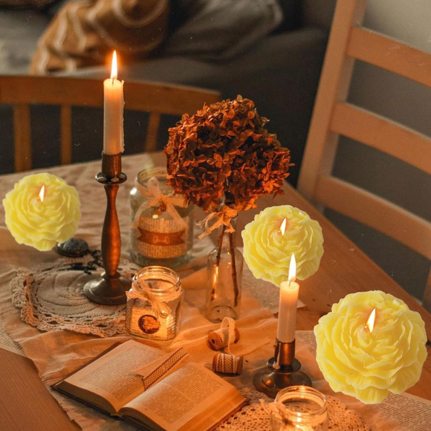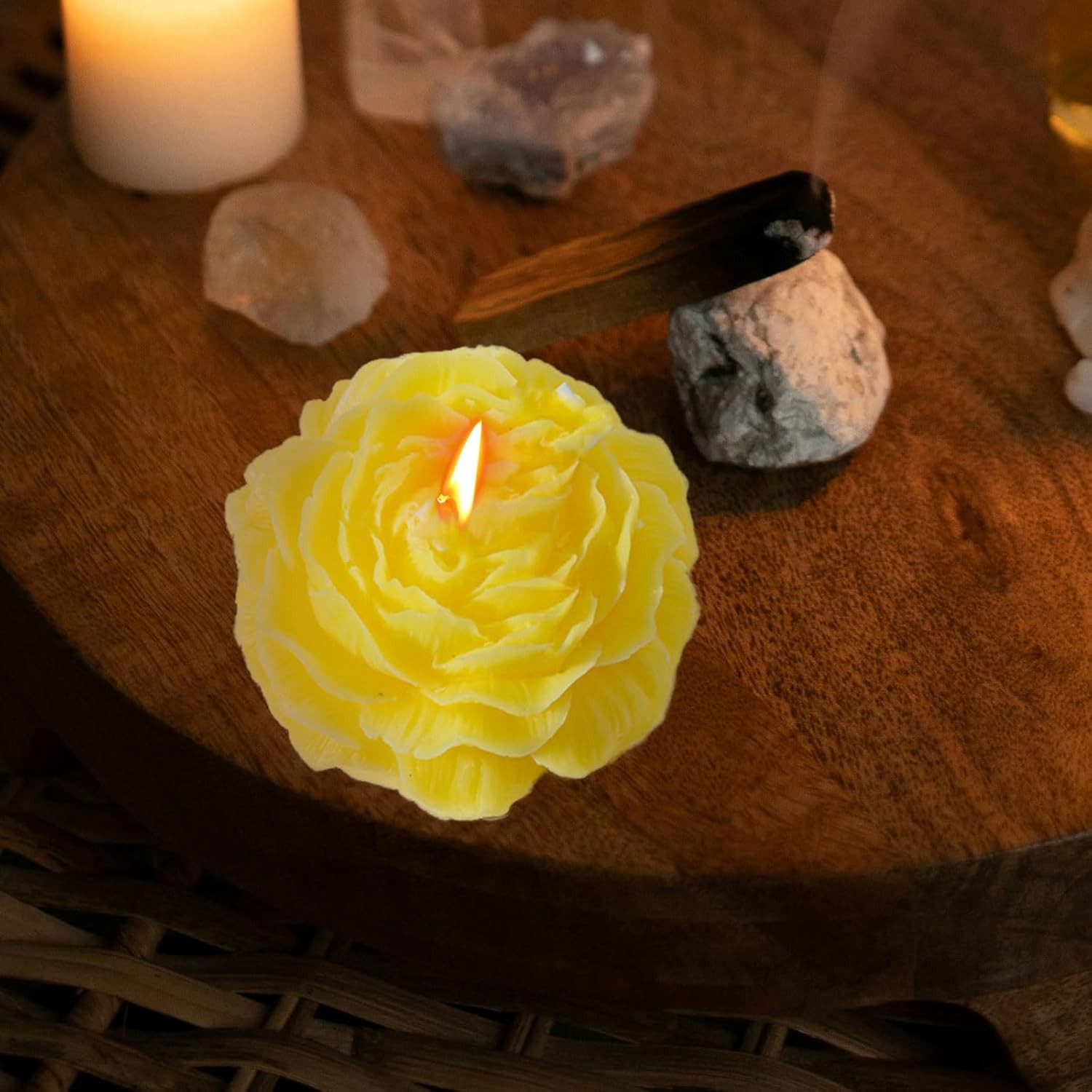 Această lumânare parfumată, cu un design delicat în formă de trandafir, adaugă un plus de eleganță și rafinament oricărui spațiu. Fabricată din ceară mixtă printr-un proces semimanual și semimecanic, oferă o ardere uniformă și o aromă plăcută, perfectă pentru relaxare și decor.