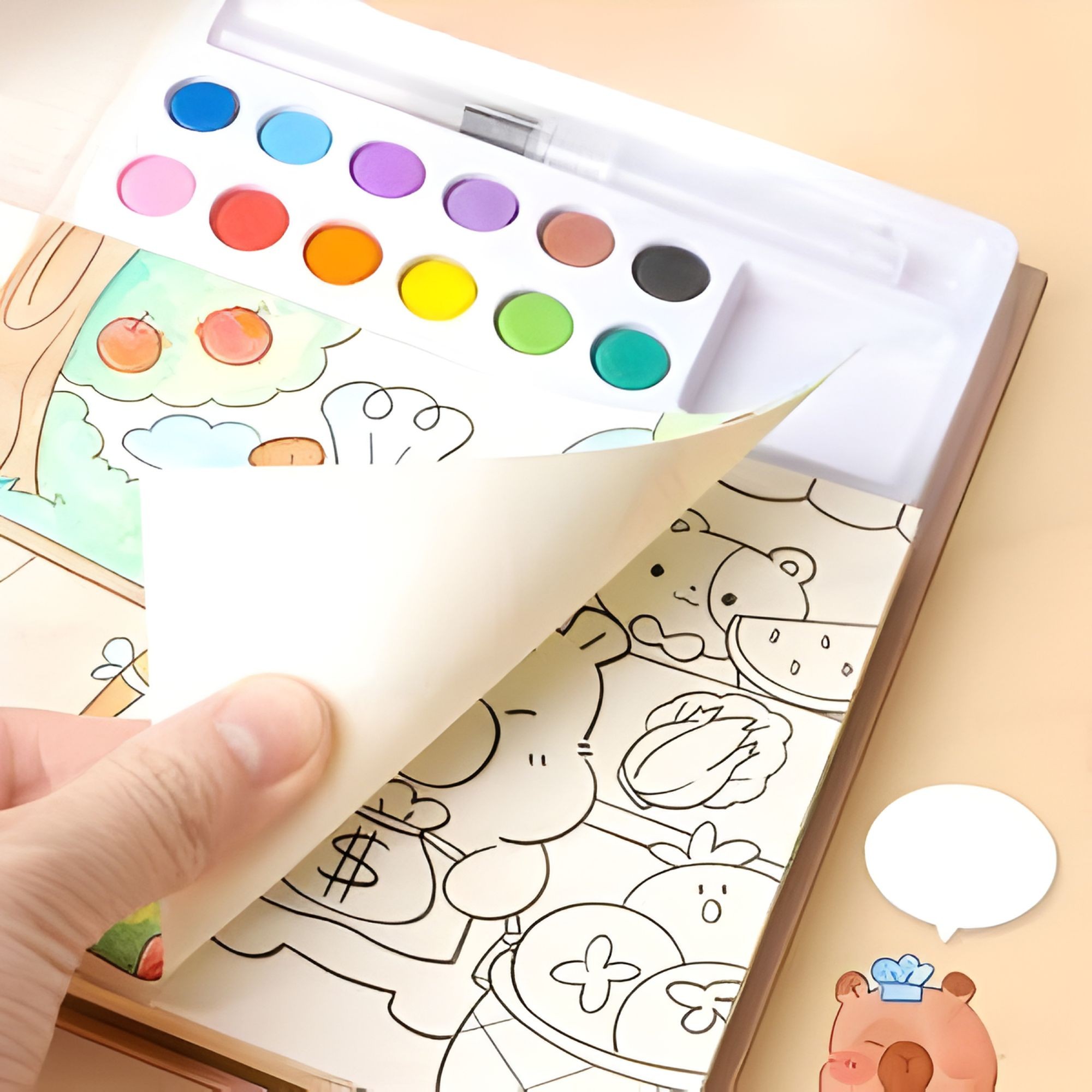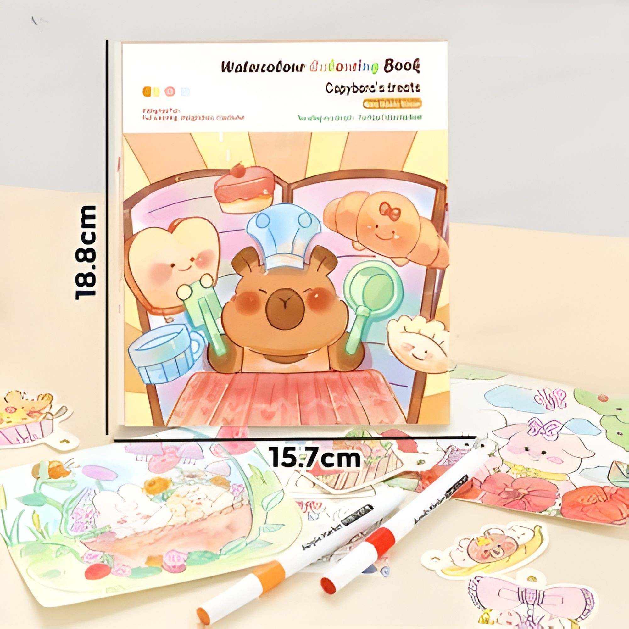 Set Carte de Colorat cu Acuarela, Flippy, Model Capibara, 20 Foi de Carton 200 gr, 12 Culori, 1 Pensula, 15.7 x 18.8 x 1.8 cm, Maro