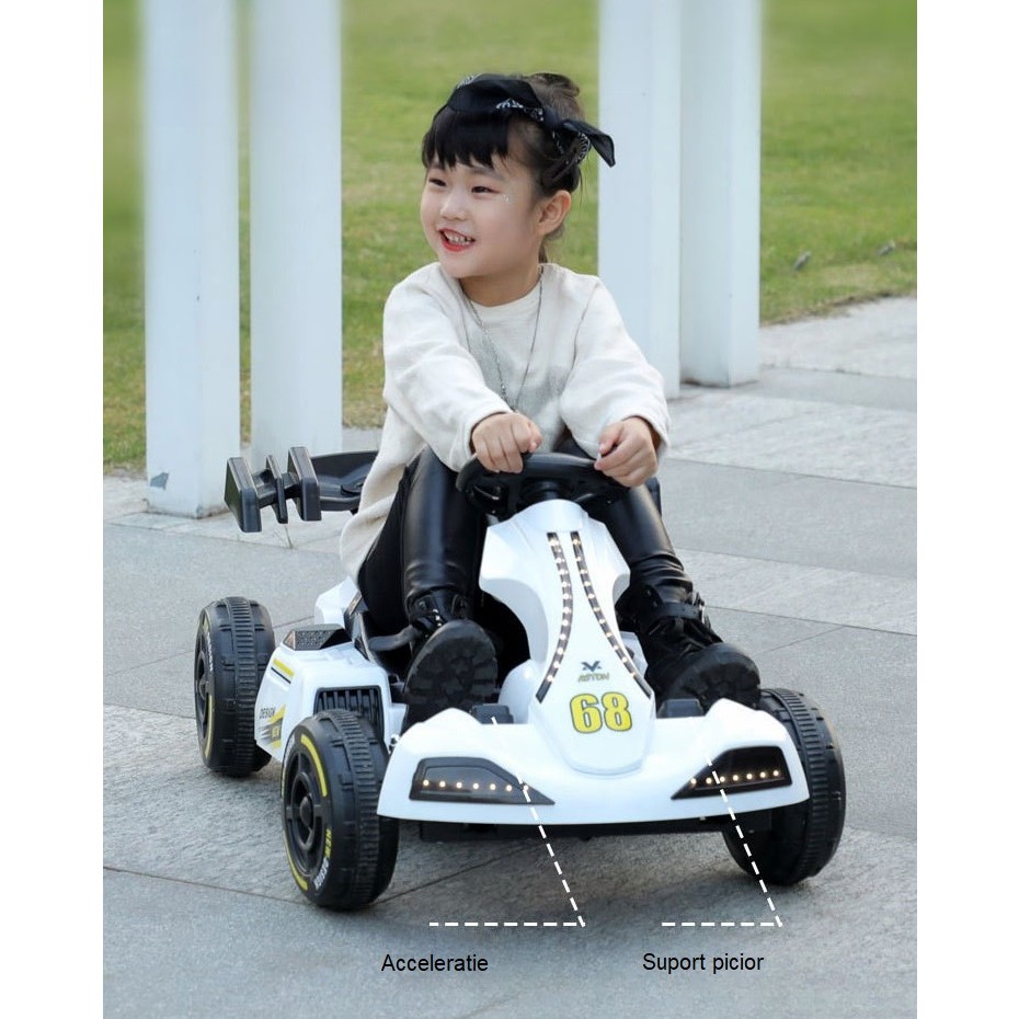 Masinuta Electrica Flippy, Tip Kart, cu Telecomanda, Dimensiune Reglabila, 2 Viteze, Sistem de Lumini si Sunet, Pentru Copii intre 1.2 - 1.6 Inaltime, 105 x 55 x 50 cm, Alb