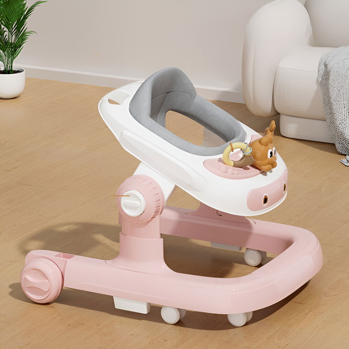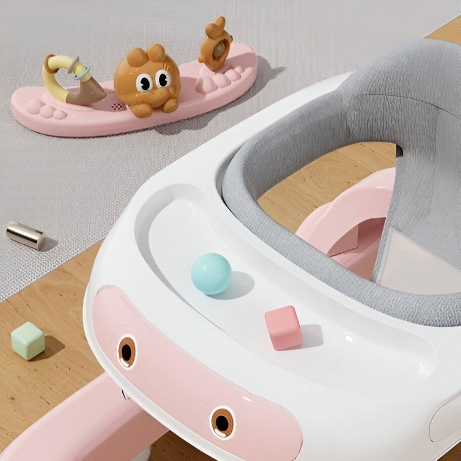 Premergatorul este conceput special pentru a atrage atenția celor mici prin culorile sale vesele și designul trendy al personajului Iepuraș. Acesta este echipat cu o pernă moale și confortabilă, care asigură sprijinul necesar pe tot parcursul utilizării. Manerul ergonomic permite copilului să se apuce ușor, oferindu-i stabilitate și încredere în timpul primelor încercări de a merge. Rotiile silențioase din material de calitate superioară asigură o deplasare fluidă, fără zgomote incomode, ce pot deranja somnul celor mici.