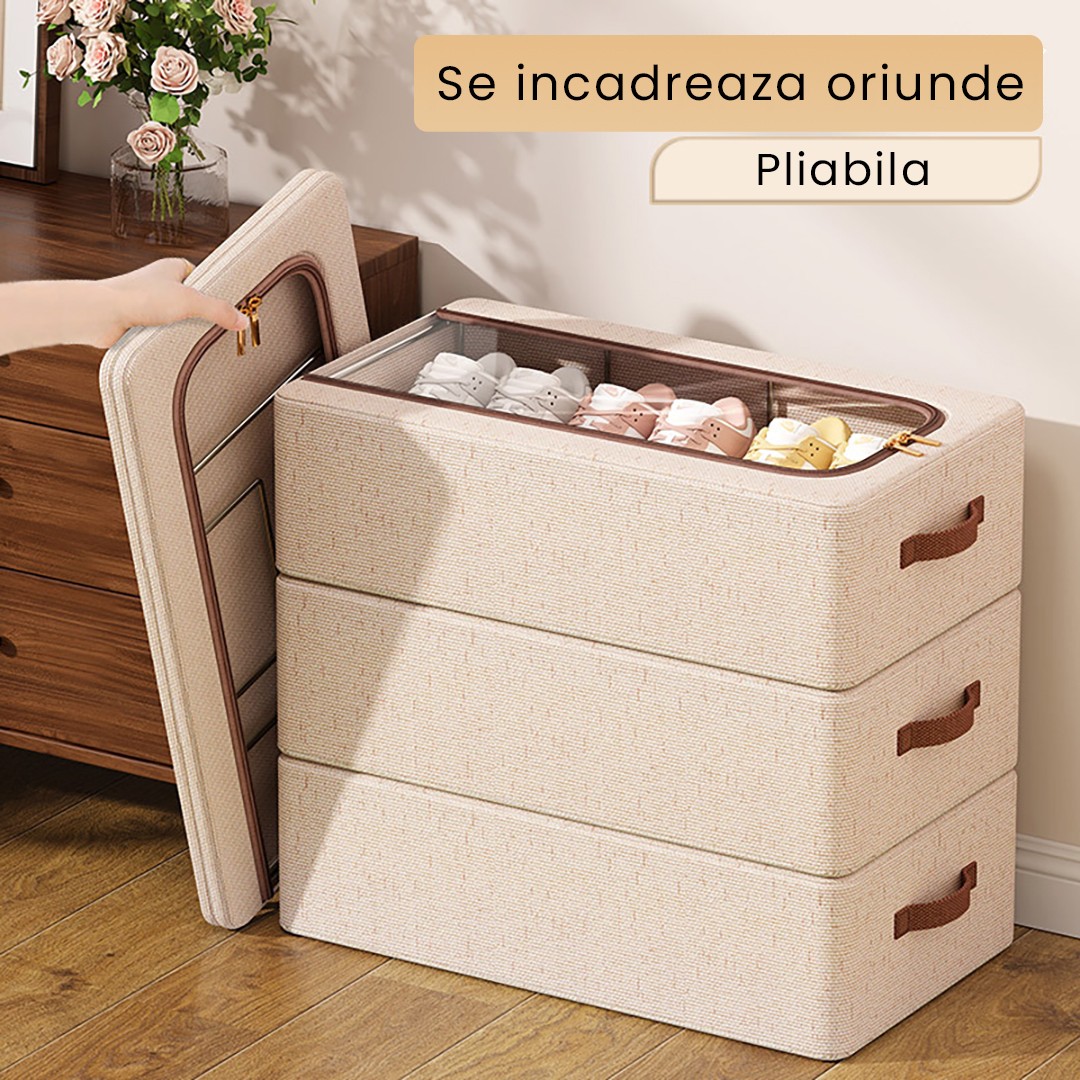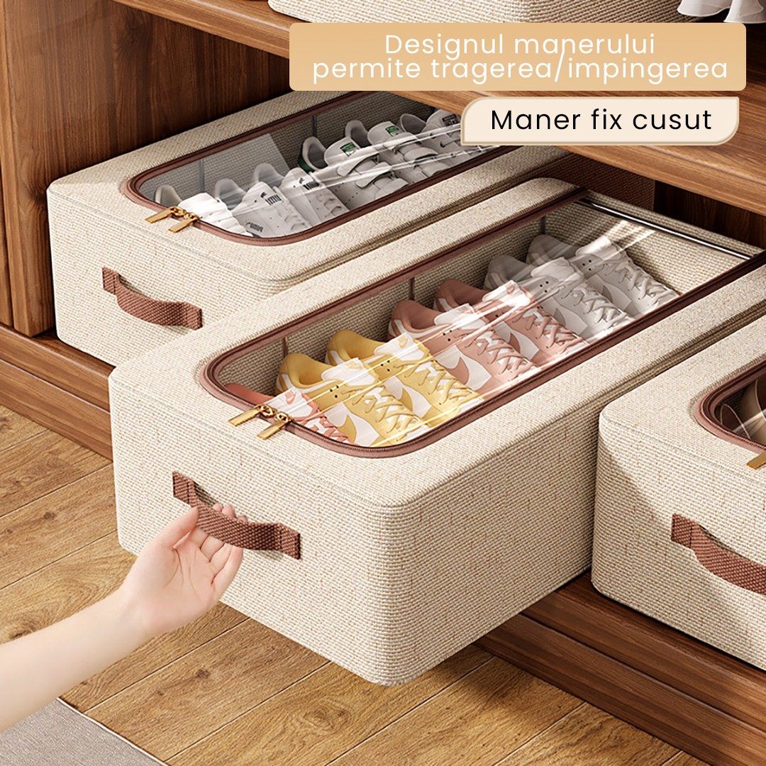 Cutie Depozitare cu Cadru Metalic, Flippy, pentru Incaltaminte, Haine, Lingerie, Fermoar Calitativ, Fereastra Transparenta, Manere Laterale, 60 x 30 x 15 cm Bej