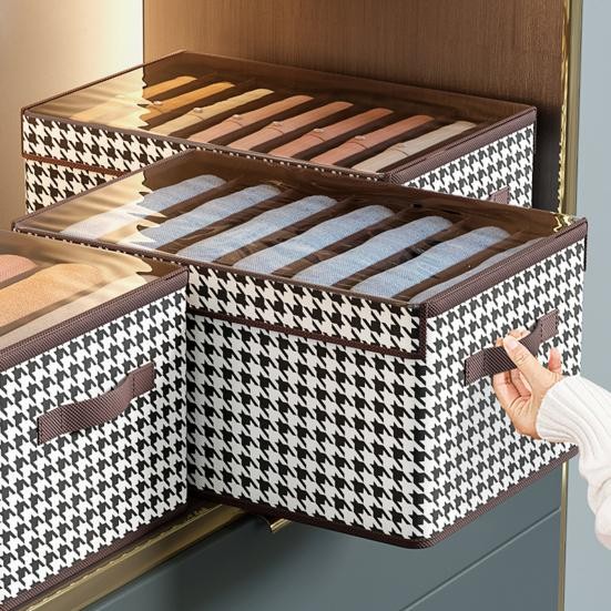 Păstrați-vă hainele și accesoriile organizate cu stil. Cutia de depozitare Flippy cu capac transparent și model în carouri este ideală pentru orice spațiu, oferind suprapunere ușoară și protecție împotriva umezelii și prafului.