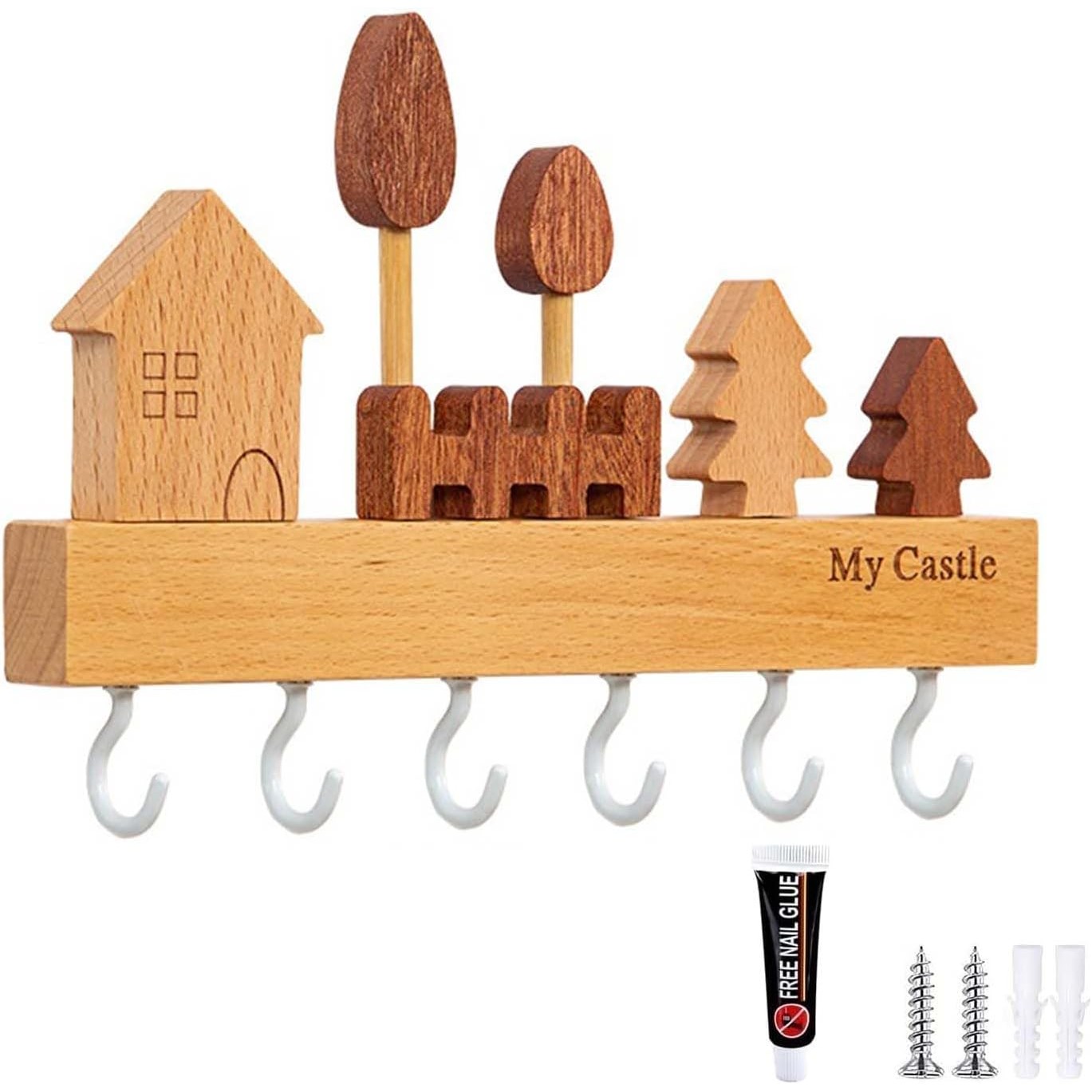 Suport pentru Chei, Flippy, din Lemn, Aplicare Fără Perforare, cu Adeziv Inclus, 6 Cârlige, 14.5 x 2 x 22.5 cm, Maro