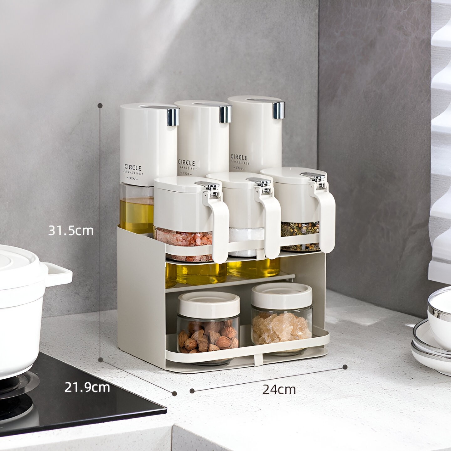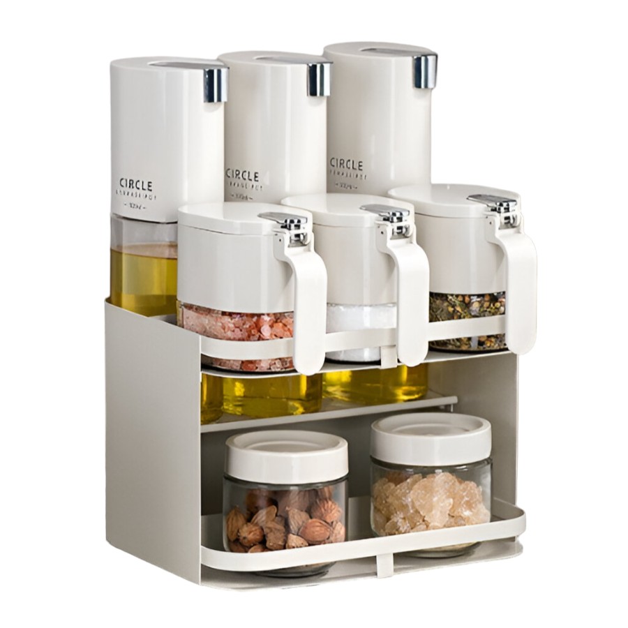 Păstrează-ți condimentele perfect organizate cu organizatorul nostru inovator de condimente. Acest set elegant și funcțional este un must-have pentru fiecare pasionat de gastronomie!