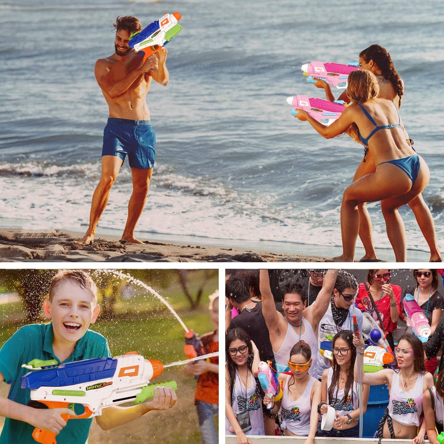 Pistolul puternic de apă adoptă designul pompei de înaltă presiune.Ușor de umplut și operat! Vă rugăm să evitați să trageți direct în față și în ochi. Designul rezistent la scurgeri permite copiilor să se joace fără să-și facă griji că apa se poate scurge.