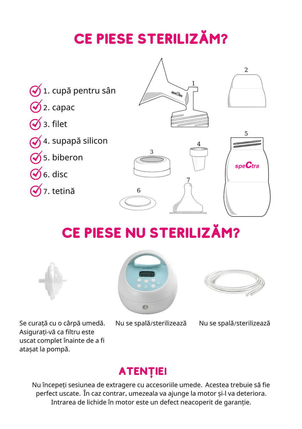 Atentie! Acest produs este un dispozitiv medical si are un caracter igienico-sanitar. El nu se returneaza, daca a fost desigilat conform  O.U.G. 34/2014 Art. 16 lit. e). Componentele care intra in contact cu laptele trebuiesc sterilizate inainte de fiecare utilizare. Laptele matern poate fi stocat 72 de ore in frigider si pana la 3 luni in congelator. Laptele matern nu se incalzeste la microunde si nu se fierbe. Folosirea componentelor la mai multe persoane poate duce la transmiterea diverselor boli.