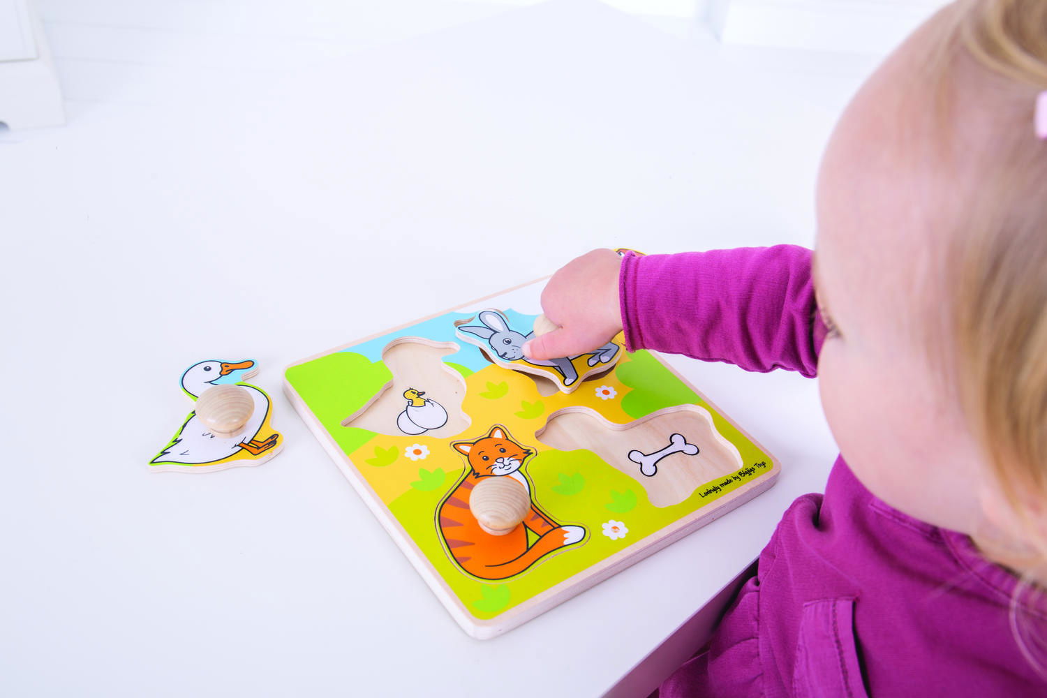 contine 4 piese tip puzzle cu diferite animale: ratusca, iepure, pisica si catel