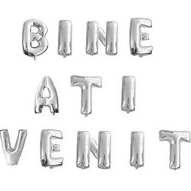Set Baloane din Folie Metalizata, Flippy, Figurine Litere, Model Bine Ati Venit, Tema Aniversare, 40 cm, Ambalaj Individual, Pai inclus, Umflare cu Aer sau Heliu, Argintiu