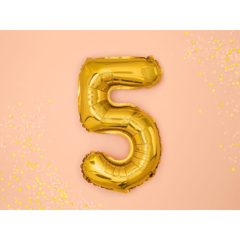 Balon din Folie Metalizata Flippy, Figurina Cifra, Tema Aniversare 100 cm, Ambalaj Individual, Pai inclus, Umflare cu Aer sau Heliu, Auriu, Cifra 5