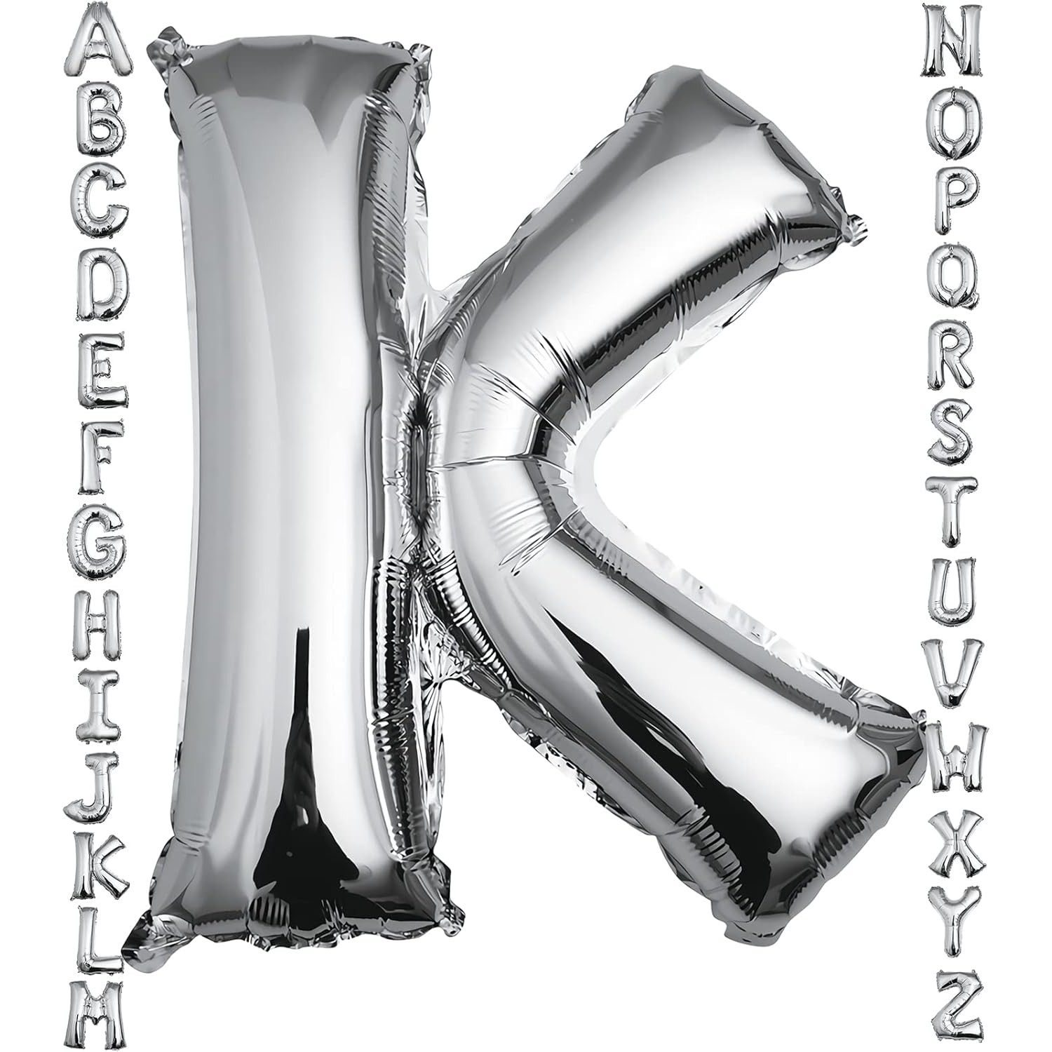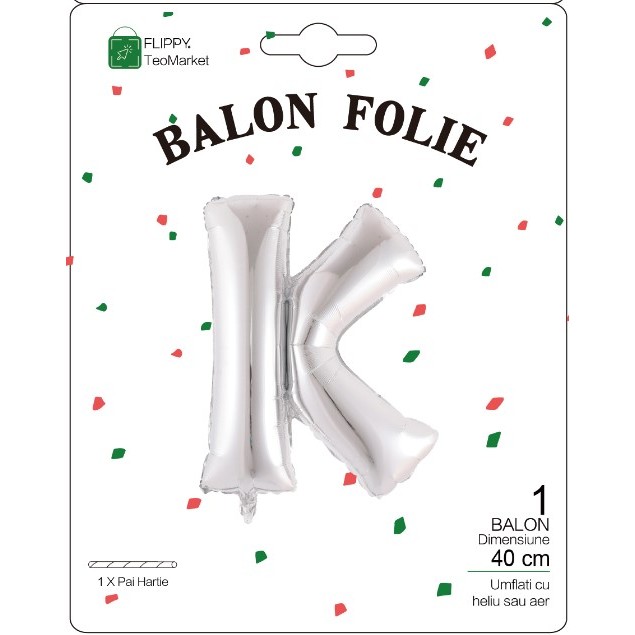 Balon Folie Metalizata Litera K, Flippy, 40 cm, Umflati cu Heliu sau Aer, Ambalaj Individual, Pai inclus, Argintiu