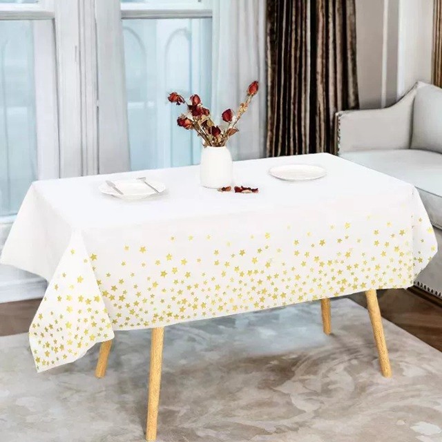 Fata de Masa, Flippy, din Folie, Imprimeu Stele Aurii, Impermeabila, 137 x 274 cm, Alb