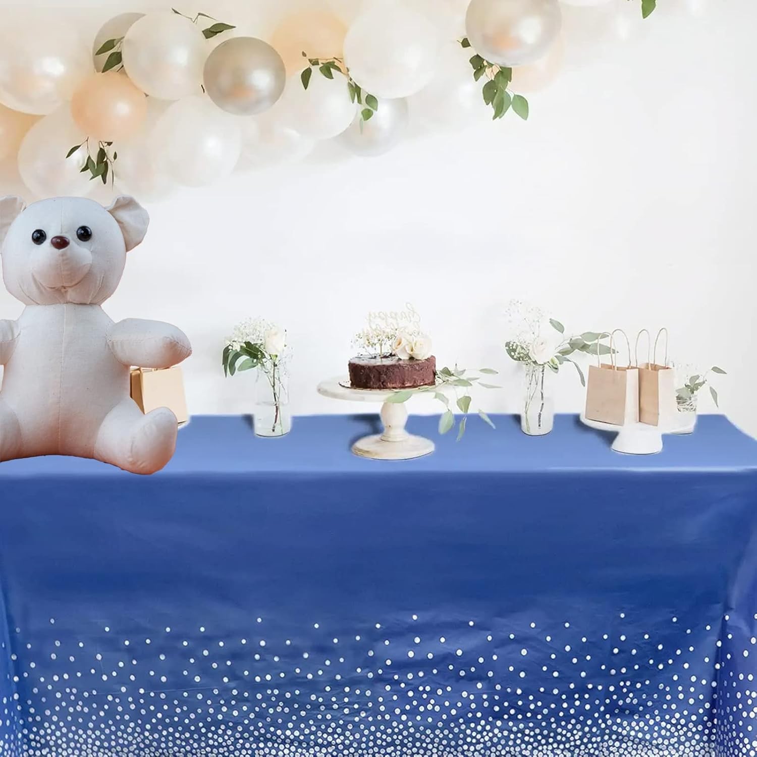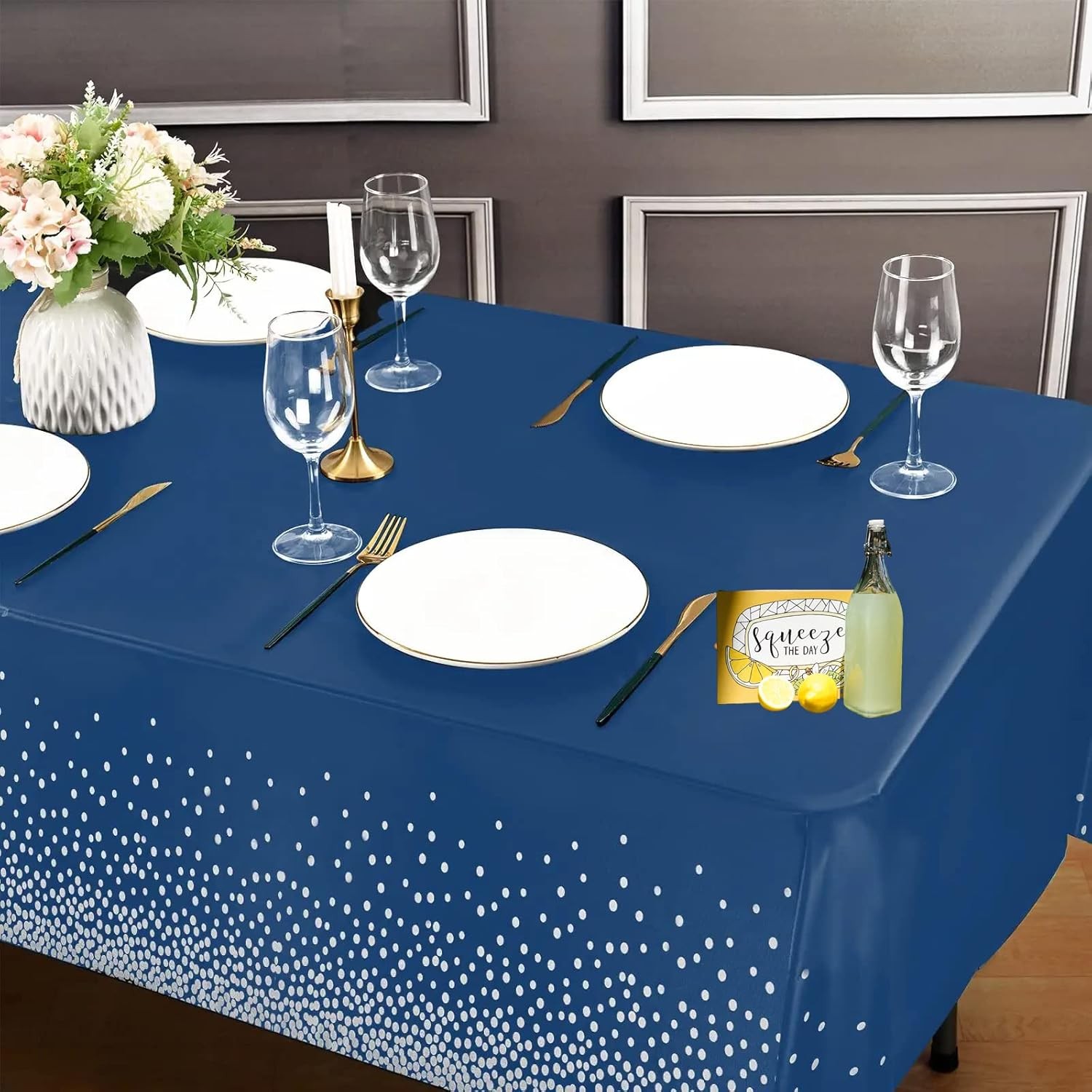 Fata de Masa, Flippy, din PEVA, Imprimeu Buline Argintii, 137 x 274 cm, Impermeabila, Fara Pete, Curatare Rapida, Albastru Inchis