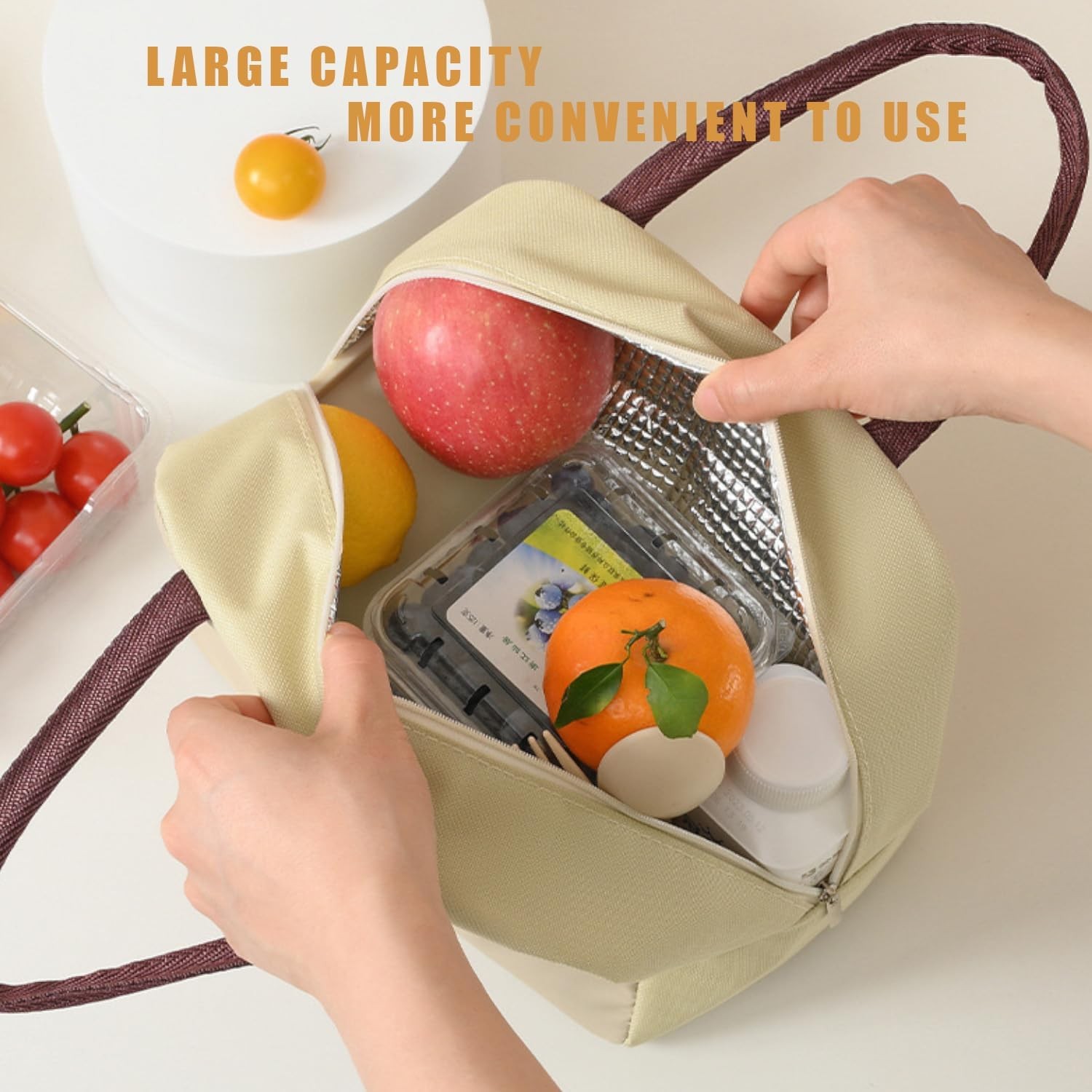 • Compartimentare Inteligentă: Geanta dispune de un compartiment principal spațios, ideal pentru cutii de prânz, fructe sau gustări, iar buzunarul exterior permite păstrarea ușoară a pachetului de șervețele sau a altor mici accesorii.