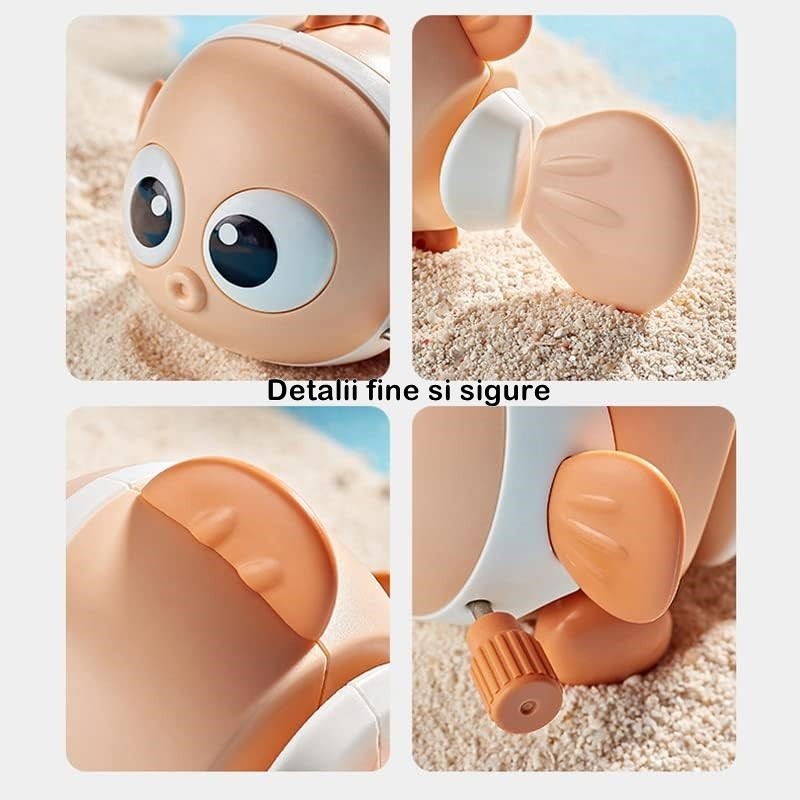 Învățare prin experiență: Jucăria "Flippy" nu doar aduce distracție, ci și oportunități de învățare prin experiență. Copiii vor putea observa cum mișcările pestișorului sunt generate de acționarea cheiței. Această experiență simplă îi va familiariza cu conceptul de cauză și efect, stimulând gândirea logică și creativă. În timp ce se bucură de joc, vor dezvolta în mod natural abilități de observație și analiză, contribuind la dezvoltarea lor cognitivă.