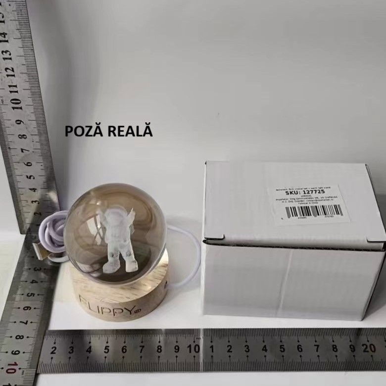 Lampa LED Decorativa, Flippy, cu Bila de Cristal cu Diametru 6cm, Model Astronaut 3D, Alimentare USB, Suport din Lemn, Lumina Alb Cald