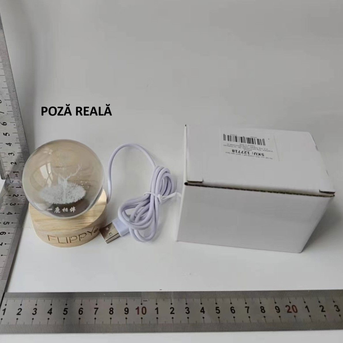 Lampa LED Decorativa, Flippy, cu Bila de Cristal cu Diametru 6cm, Model Cerb 3D, Alimentare USB, Suport din Lemn, Lumina Alb Cald