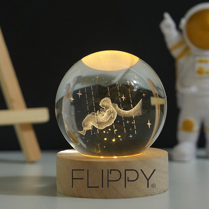 Lampa LED Decorativa, Flippy, cu Bila de Cristal cu Diametru 6cm, Model Micul Print 3D, Alimentare USB, Suport din Lemn, Lumina Alb Cald