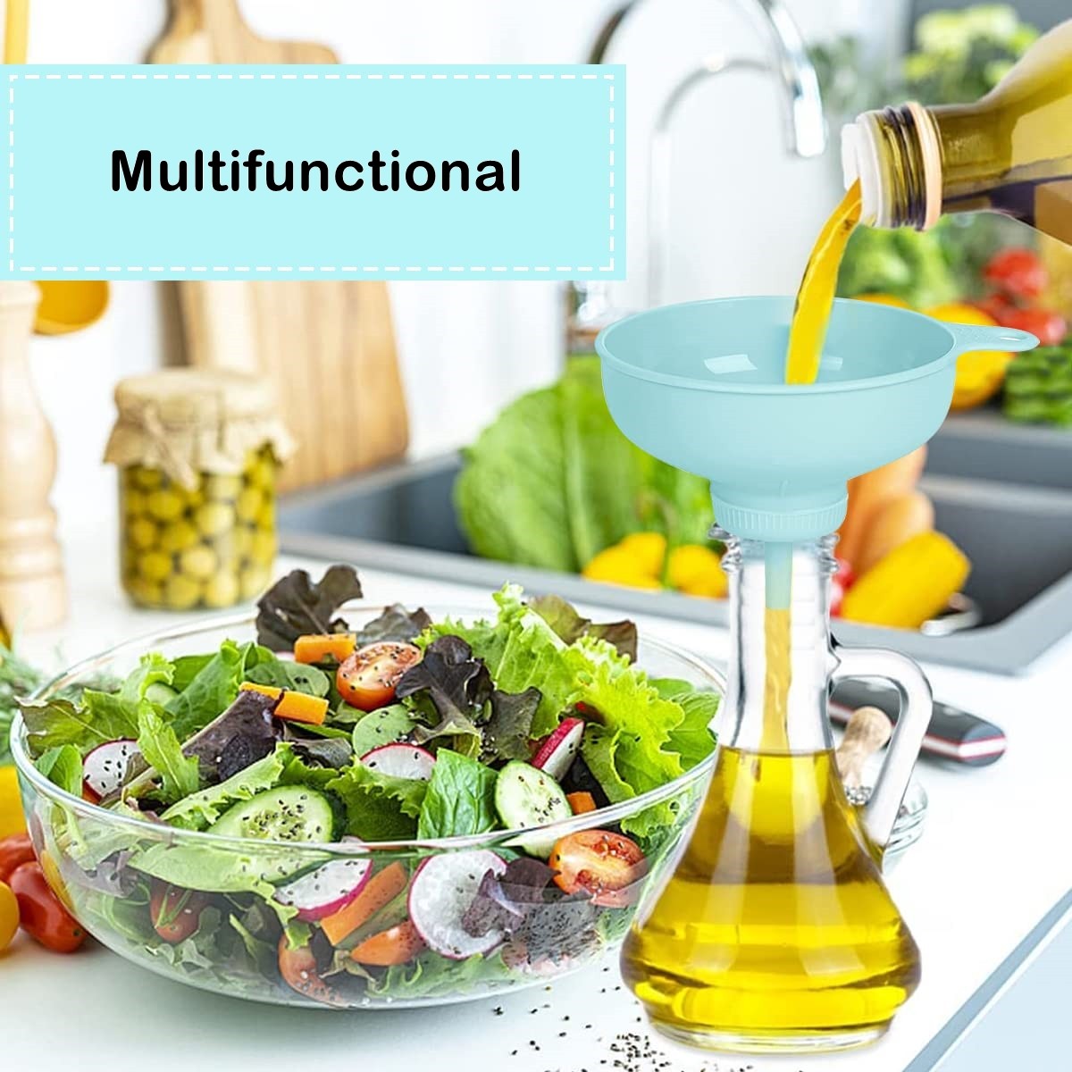Funcționalitate multiplă: Această palnie oferă trei funcționalități într-un singur produs. Poate fi utilizată pentru a scurge lichide, pentru a turna cu precizie și pentru a filtra reziduurile nedorite. Această versatilitate economisește timp și spațiu în bucătărie.