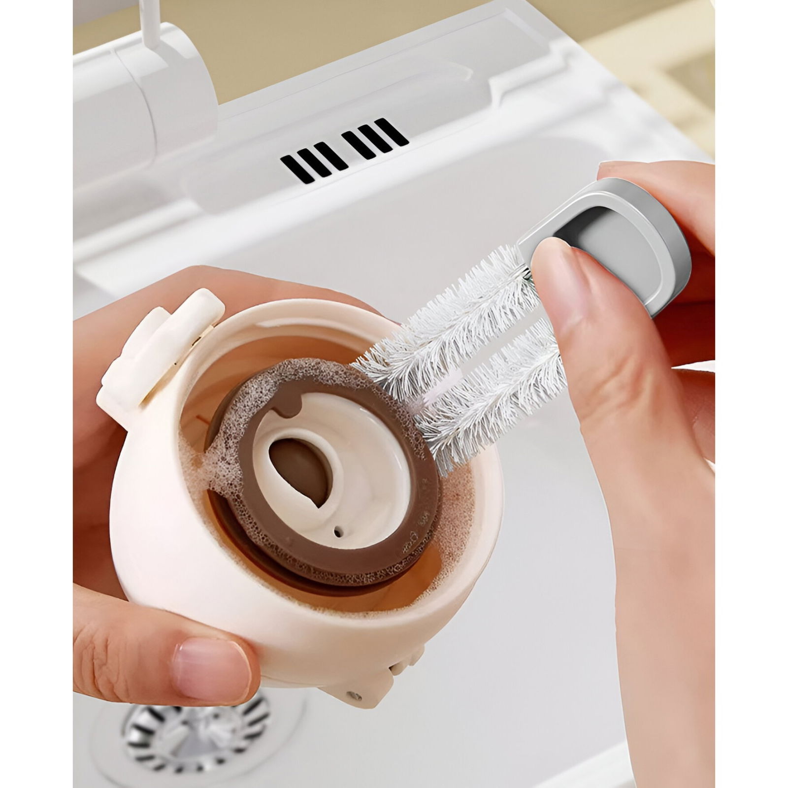 - Capul de perie din burete îndepărtează murdăria de pe pereții și fundul cupelor, în timp ce peria moale din cauciuc cu dungi duble țintește petele de pe marginea superioară a cupei.