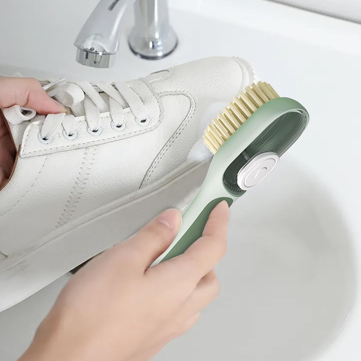 Această perie multifuncțională este alegerea ideală pentru curățarea rapidă și eficientă a pantofilor și a altor suprafețe. Cu un mâner ergonomic lung și un recipient integrat pentru lichid, îți permite să aplici soluția de curățare direct pe suprafață, economisind timp și efort.