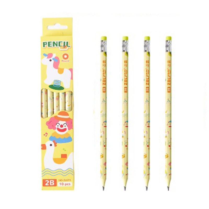 Set 10 Creioane Negre, Flippy, 2B, pentru Elevi Scoala, cu Radiera, Model Galben cu Circ