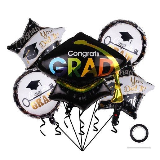 Baloane cu tematica Absolvire, Flippy, set din 5 baloane, 1 Figurina Toca, 2 stele, 2 rotunde, din folie de aluminiu, 70 x 40 cm, Aer si Heliu, Alb Negru