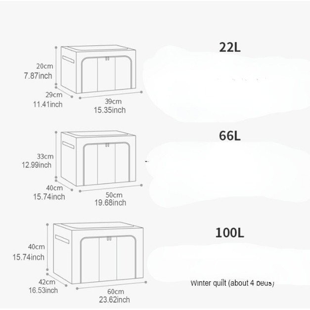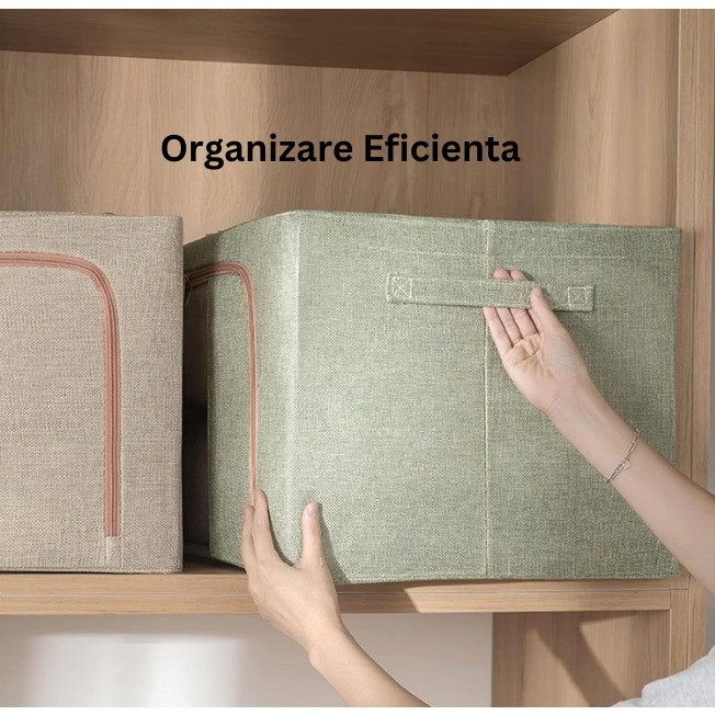 Dimensiunile de 50x40x33 cm o fac ușor de integrat în orice spațiu, fie că este vorba de dormitor, dressing sau camera de zi. Designul pliabil permite economisirea spațiului atunci când cutia nu este utilizată. Dotată cu un fermoar bidirecțional, cutia oferă acces rapid și simplu la conținutul său, asigurând în același timp protecția obiectelor depozitate.