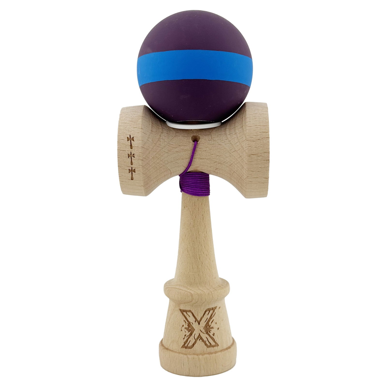 Kendama X Originala, Profesionala, Flippy, Cupe Mari KING SIZE V3, Rubber Grip, Gaura in Baza, Rulment Metalic, din lemn 18 cm, Ata 62/65 cm, M Mov/Albastru/Mov