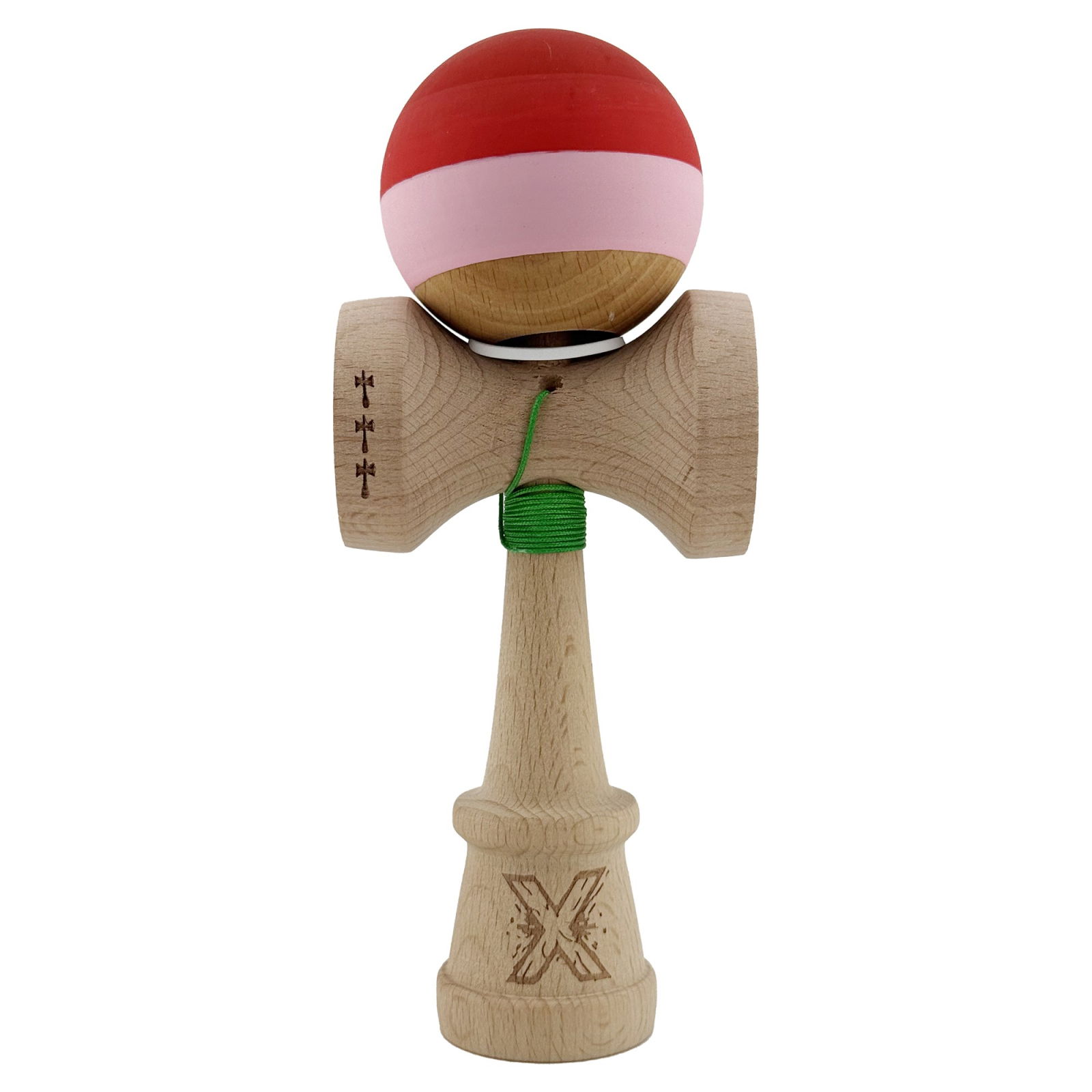 Kendama X Originala, Profesionala, Flippy, Rubber Grip, Cupe Mari KING SIZE V3, Gaura in Baza, Rulment Metalic, din lemn 18 cm, Ata 62/65 cm, Special Rosu/Roz/Maro