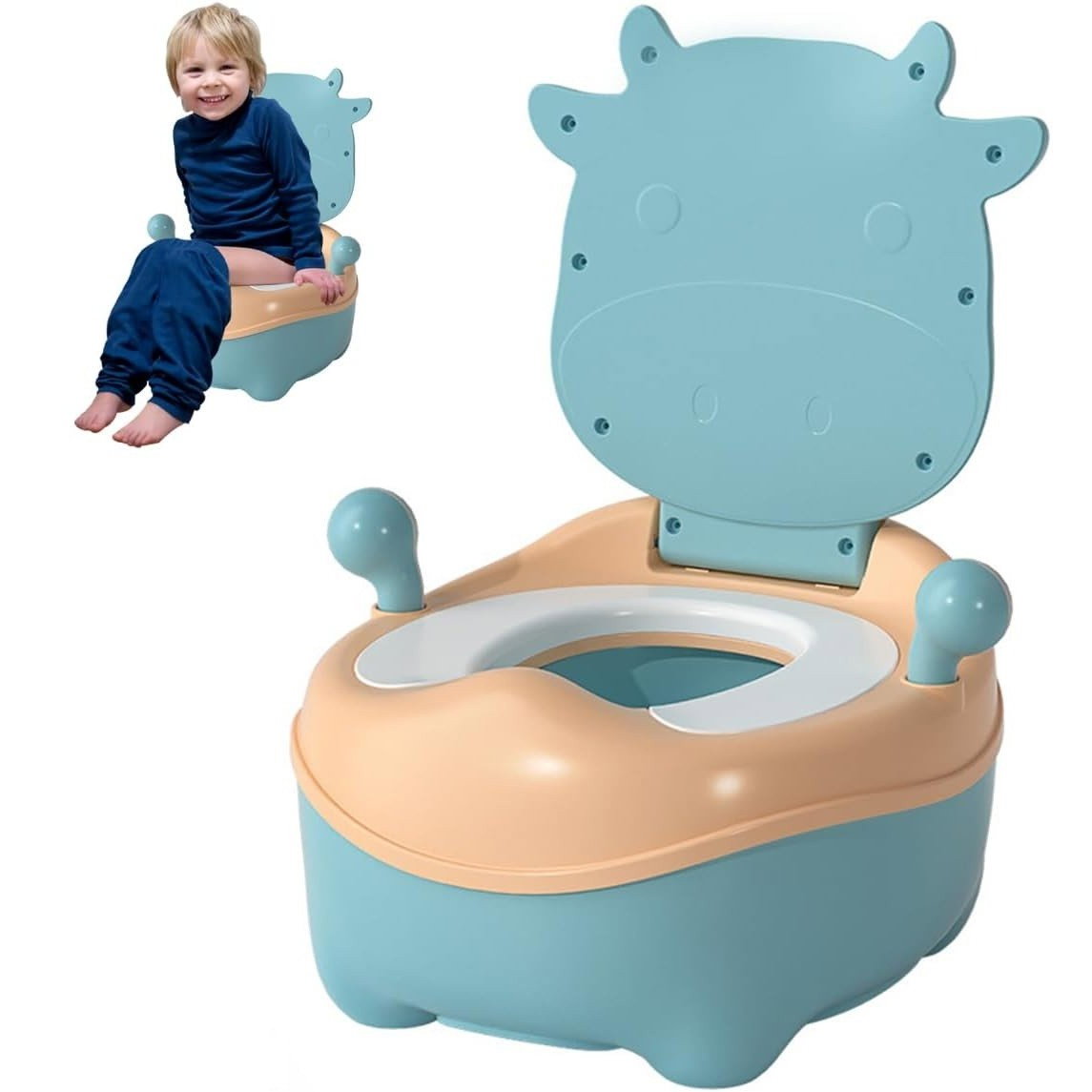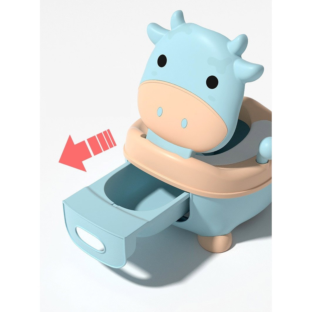 Olita pentru Copii, Flippy, +1an, Portabila, Model Vacuta, cu Capac, Prietenoasa, Non-Toxic, Compartiment Detasabil, cu Manere, cu 4 Picioare, Usor de Curatat, Albastru