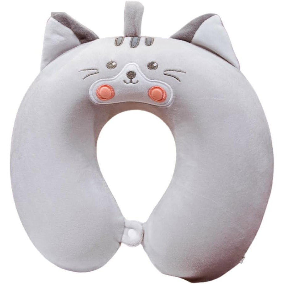 Perna de Calatorie in Forma de U, Flippy, Pentru Gat si Cap, Umplutura din Spuma cu Memorie, 30x30 cm, Model Pisica, Accesoriu de Voiaj, Birou, Masina, Sistem Prindere Capse, Gri