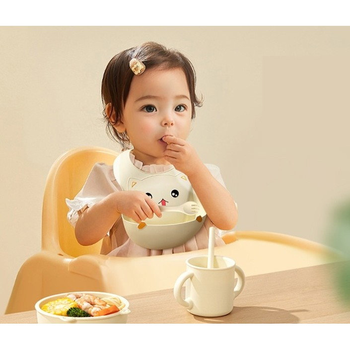 Set 2 Piese Diversificare Bebeluși și Copii din Silicon, Flippy, Model Pisicuță, Bej, Fără alergeni, potrivit >12 luni