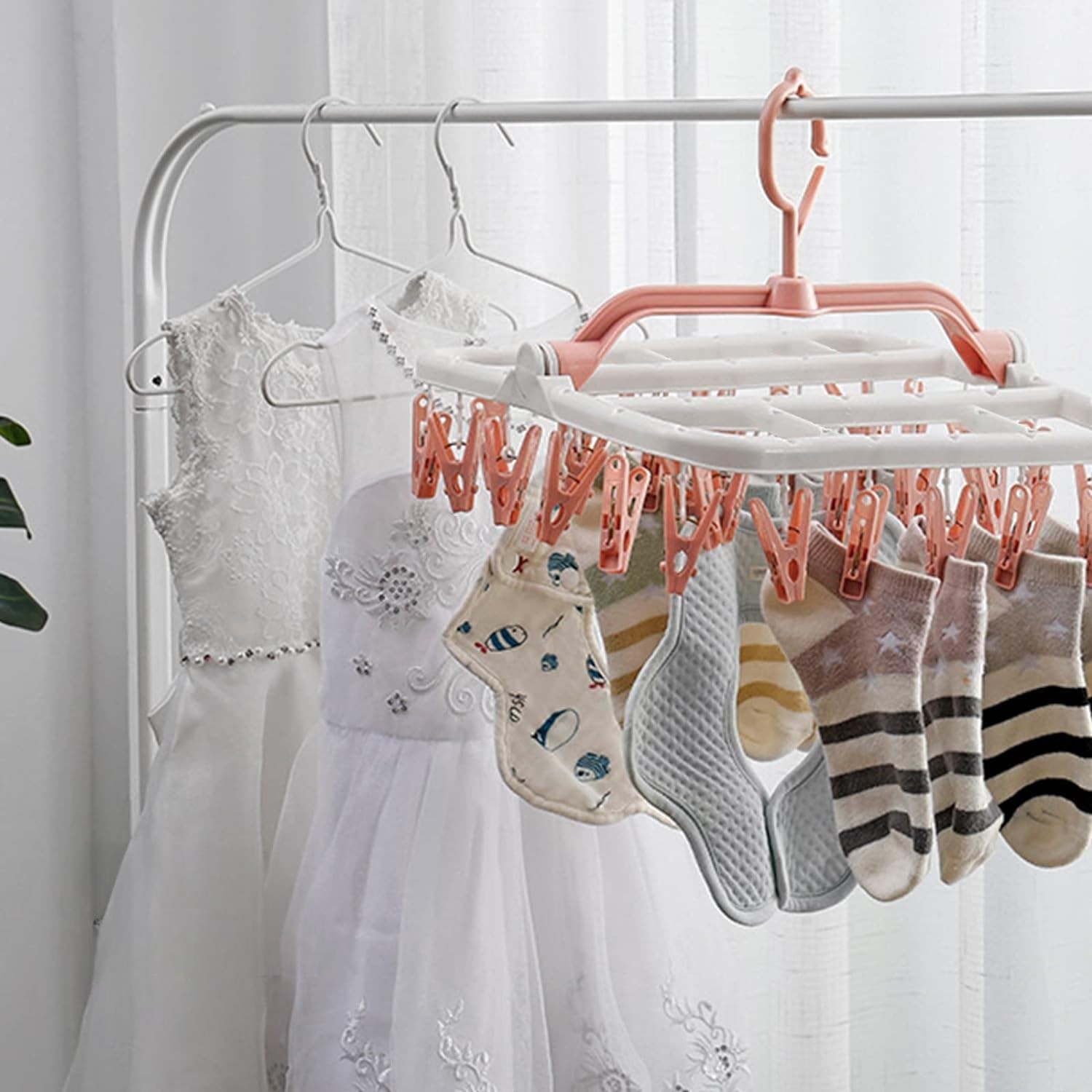 Uscator de Rufe Suspendat Flippy, cu 40 Carlige, Rotire 360 Grade, Protectie Vant, Pliabil, Patrat, Mateiral Plastic, Usor de Depozitat, Multifunctional, 36 x 24 cm, Alb/Roz