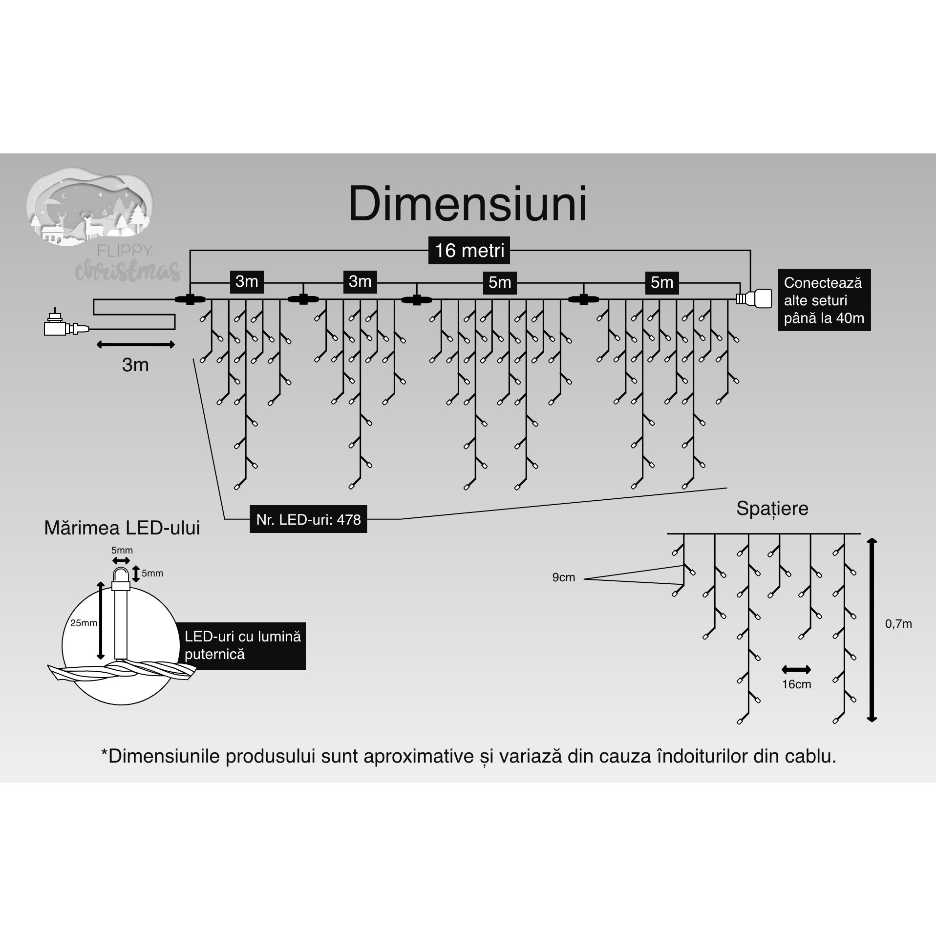 Suprafata luminoasa are un total de 16 m metri. Lungimea prelungitorului este de 3 metri. Ofera posibilitatea de a suspenda ghirlanda astfel incat sa poata fi ascuns cablul de alimentare atunci cand este conectat la priza.