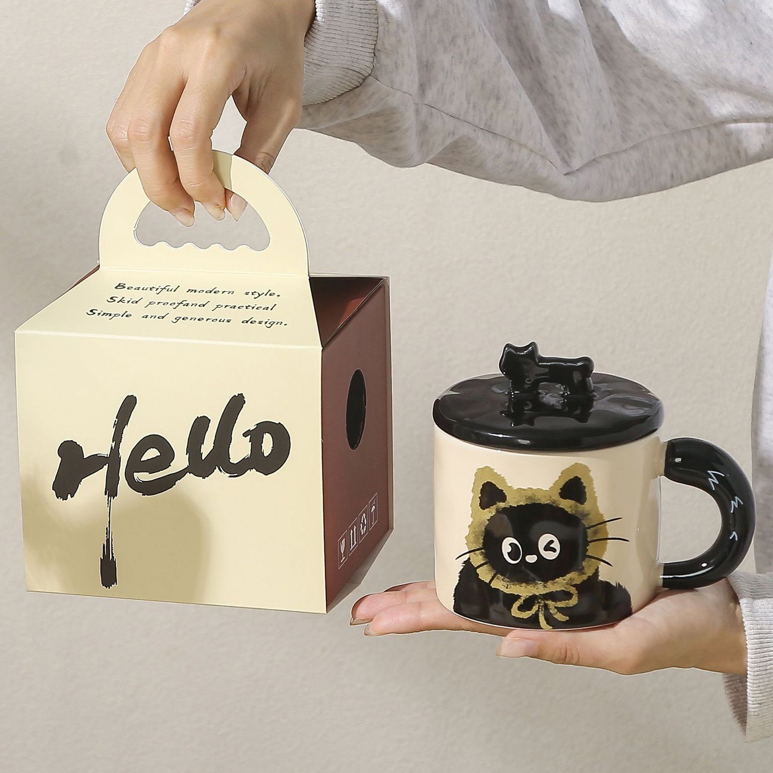 Cana din Ceramica, Flippy, Model in Cutie pentru Cadou, Cana pentru Ceai, Cafea, Cana Retro Design Capac cu Figurina 3D, Bej, Print Pisica
