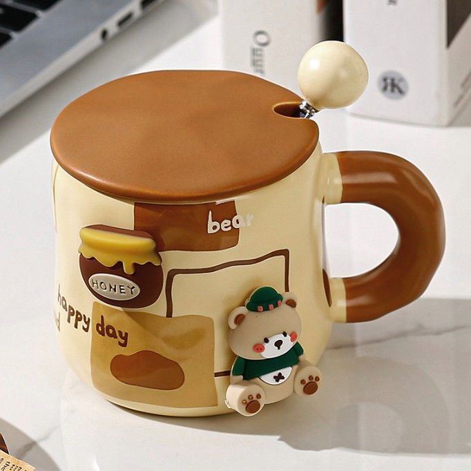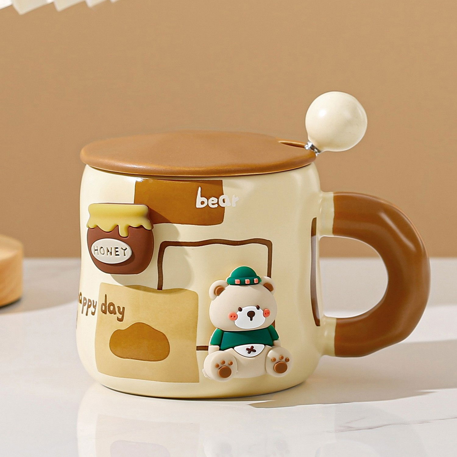 Cana din Ceramica, Flippy, Model Urs pentru Baieti, Cana Universala, Cana pentru Ceai, Cana cu Lingura Metalica si Capac
