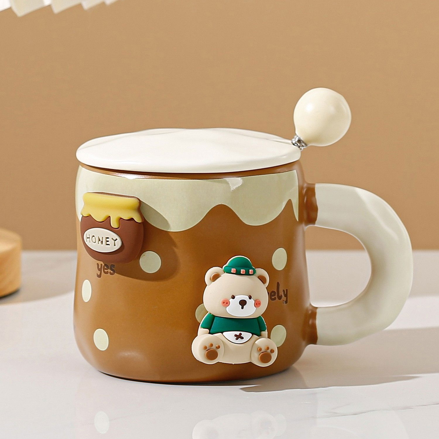 Cana din Ceramica, Flippy, Model Urs pentru Baieti, Cana Universala, Cana pentru Ceai, Cana cu Lingura Metalica si Capac, 9.6 x 9.5 x 9.5 cm, 400 ml Maro inchis