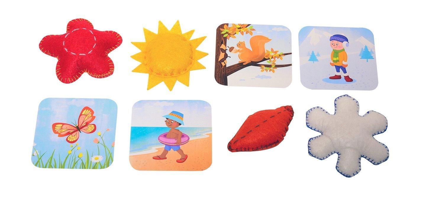 Regulament: Jucatorul care isi aminteste primul un cantecel cu anotimpuri incepe jocul. El/ea trage un card din teancul din centru. Toti copiii se uita la cardul respectiv si se gandesc la ce anotimp il pot incadra. Dupa ce ai stabilit anotimpul, alege una dintre cele 4 piese din fetru (floricica, soare, frunza sau fulg de nea) si asaz-o pe cardul cu anotimpul corespunzator. Primul jucator care pune piesa de fetru corecta peste anotimpul potrivit castiga cardul tras din teanc. Spre exemplu, cardul tras din teanc este un “Ventilator”. “Ventilatorul” apartine anotimpului “vara”. Primul jucator care asaza “Soarele” din fetru peste cardul cu anotimpul “Vara” castiga cardul cu “Ventilator”. Daca un jucator nu alege piesa din fetru corecta sau o asaza peste un alt anotimp, trebuie sa puna la loc in teanc un card castigat in rundele anterioare. Daca nu a castigat inca nici un card, atunci nu face nimic. Jocul se termina cand cardurile din teanc s-au terminat. Jucatorul care la sfarsitul jocului are cele mai multe carduri castiga jocul.